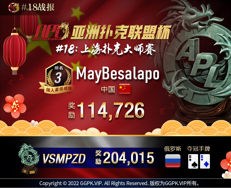 APL#18: 上海扑克大师赛 国人MayBesalapo夺得季军,获得114,726奖励。冠军由俄罗斯玩家 VSMPZD 夺下,斩获204,015奖励。